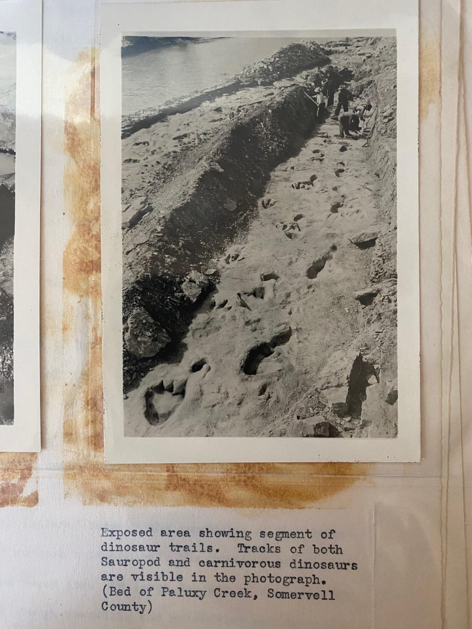 Probably the most famous thing to come out of the WPA projects was the discovery and excavation of Early Cretaceous dinosaur tracks at Glen Rose, a little town about an hour or two south of Dallas, nestled against the bends of the shallow, limestone-bottomed Paluxy river. “There is no doubt now that I have made a very fortunate strike in regard to sauropod footprints here,” wrote in Roland T. Bird, a paleontologist in Texas under the auspices of the American Museum of Natural History. “I hardly dreamed such beautiful trails would be uncovered. It seems to have grown into the footprint opportunity of a lifetime. I only wish that more people could see it while occasion exists.” The excavation — which eventually ended up 210 feet long and 40 feet wide — was clearly a bitch to work on: the WPA men had to dam and divert the river with sandbags and then pump out the water to uncover the tracks, and whenever it rained, the waters of the Paluxy spilled over the sandbags and reflooded the dig site.