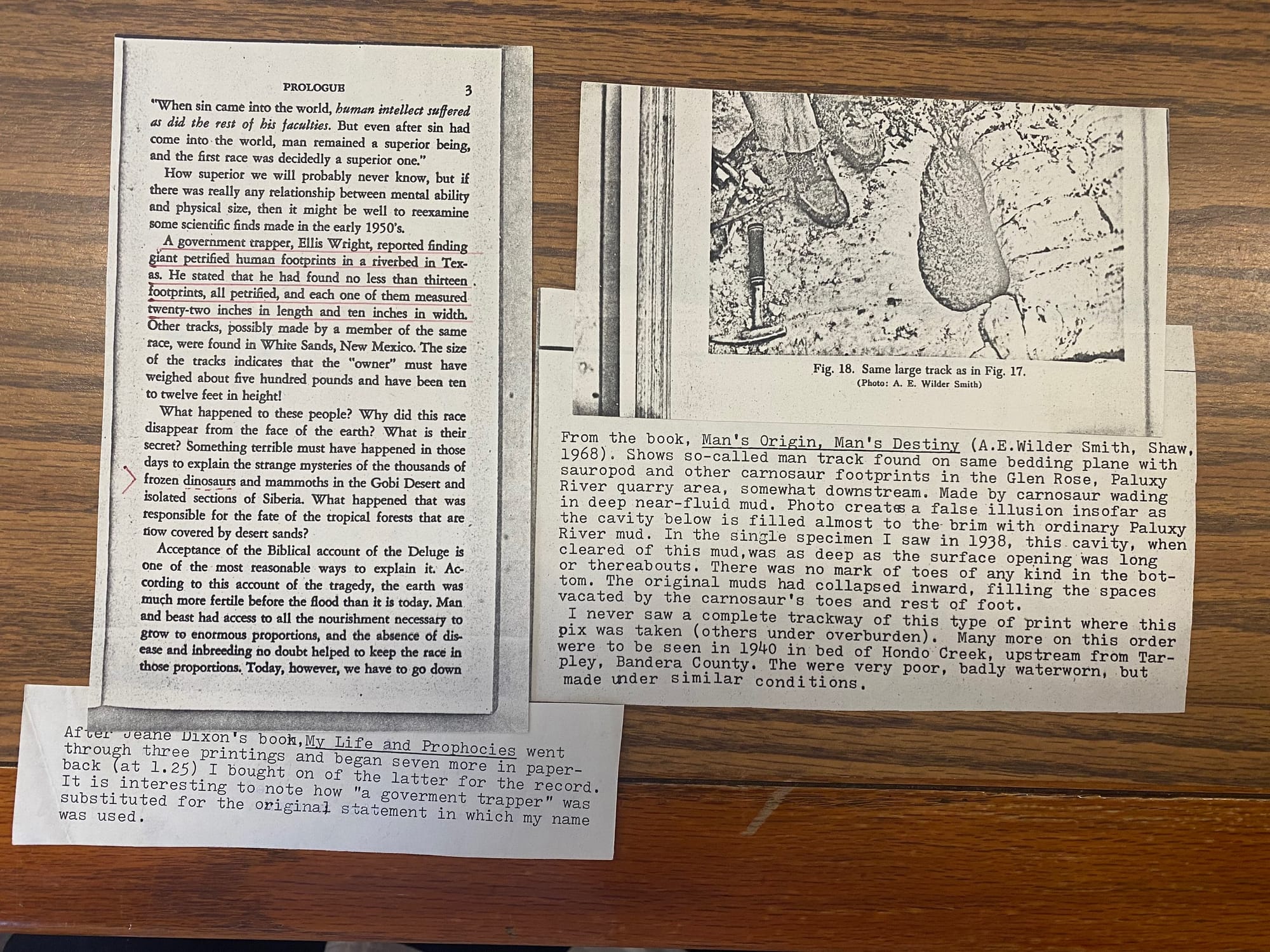 Can you imagine my mental anguish as I read, "Dr. Roland T. Bird of the Department of Vertebrate Paleontology of The American Museum of Natural History reported finding giant petrified human footprints along with those of dinosaurs in a river bed in Texas"? It was appalling to think of how many thousands of homes in America this book was invading at this very moment, from libraries and book stores everywhere.