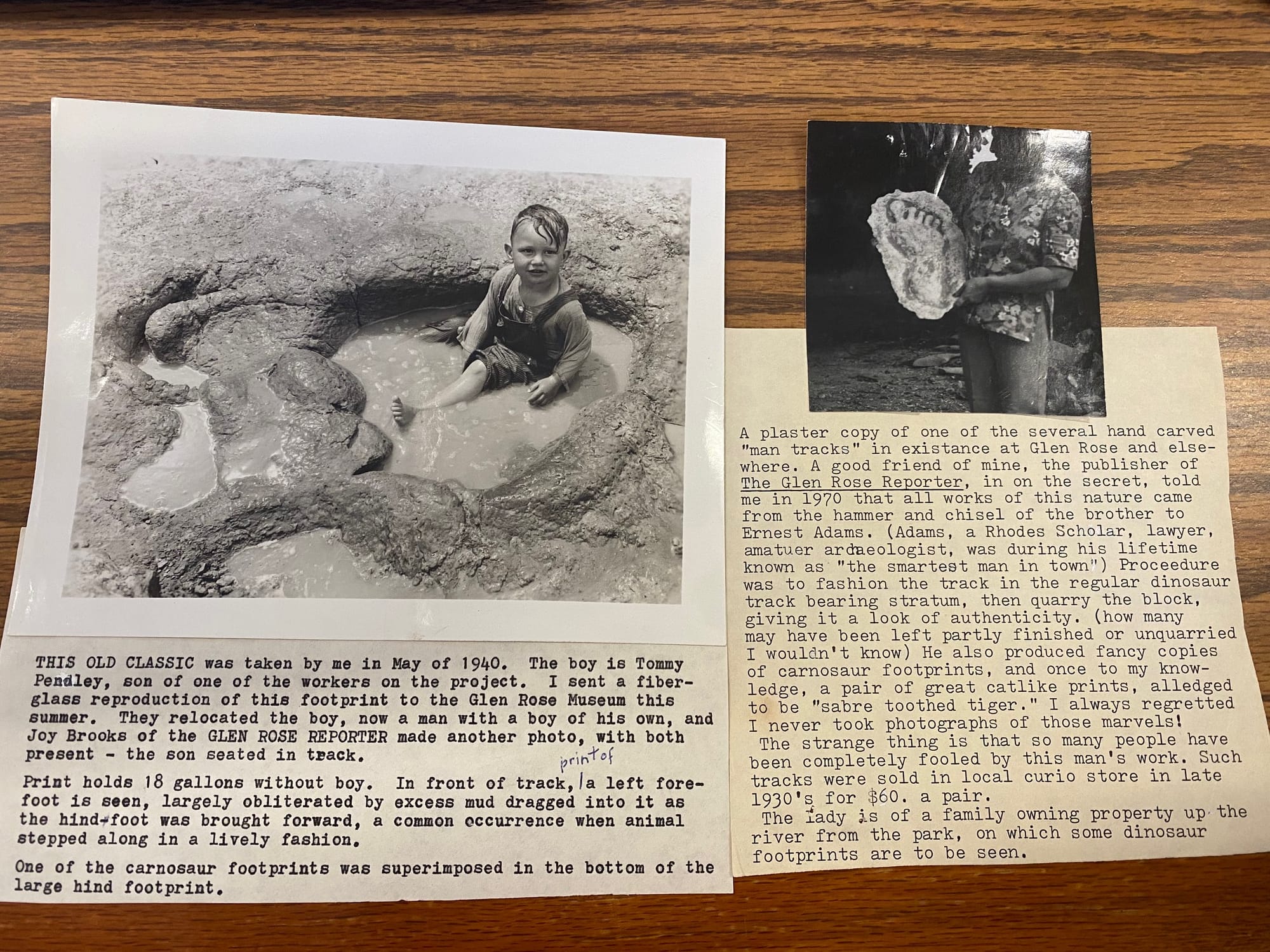 “How did I ever get caught up in these persistent arguments (based on these and other "tracks") that hold that men and dinosaurs existed on earth at the same time together? I made the unfortunate mistake of describing all too well both the fake and the real variety in the first article I turned out for Natural History relating the discovery of the Glen Rose sauropod footprints. But these were the days when both Barnum Brown [the discoverer of T.rex and main paleontological curator at the AMNH] and I were dependant on the Sinclair Oil Refining Company for field work grants. As the company sometimes featured Barnum's planned expeditions in their national advertising, it behooved [us] later to write articles that would please old Harry Sinclair and soften him up for yet another season…Thus the article on the discovery of sauropod footprints at Glen Rose, Thunder in their Footsteps, intended for Sinclair's eyes as much as anybody's, went to press, with me trying to add a touch of mystery by bringing in the "man tracks." Who could dream of what might happen, what did happen!