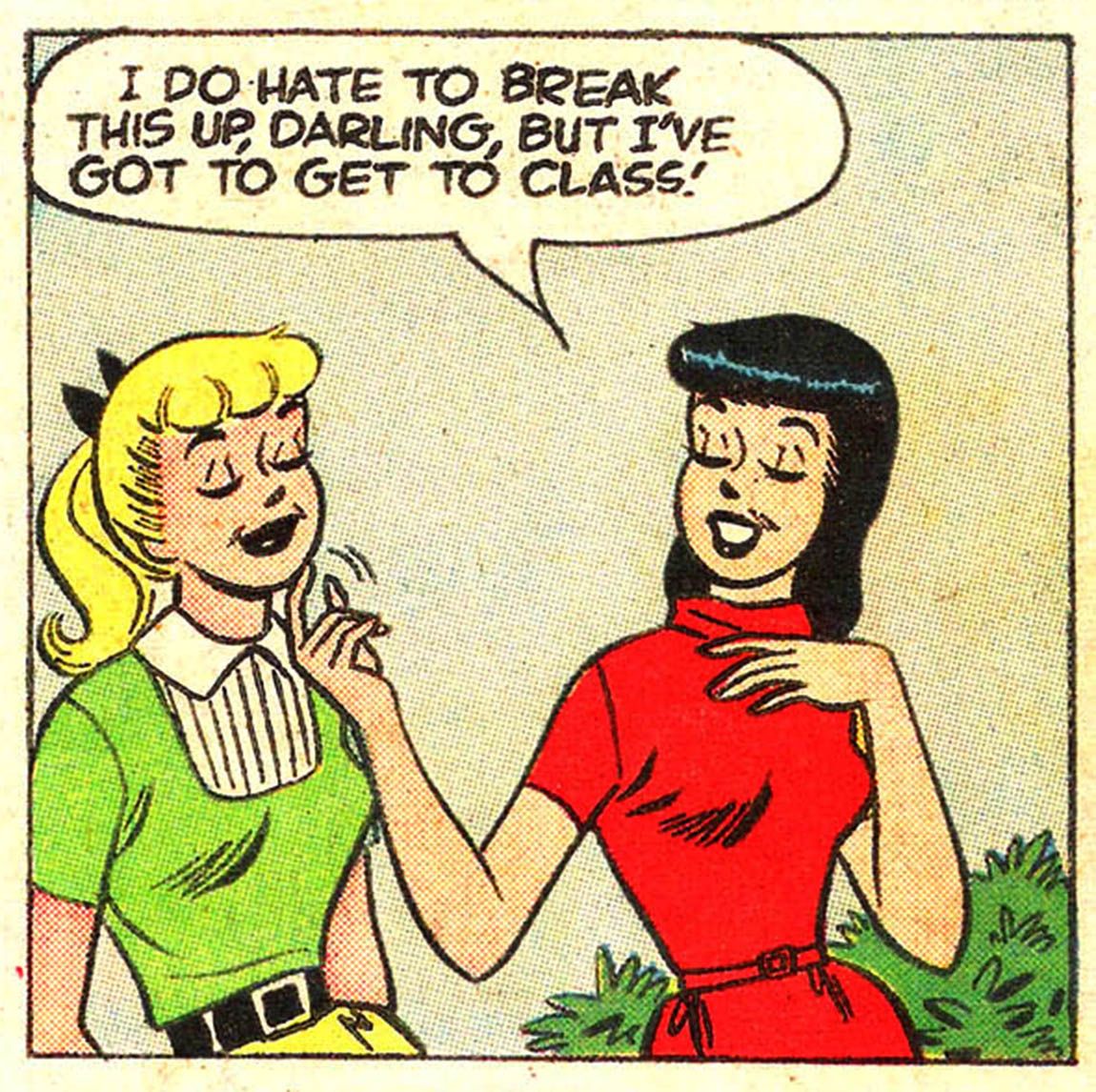 But there’s a fundamental imbalance between the two. Veronica sets the beat in most of her relationships, knows it, and enjoys it: her interest in boys is generally in their role as status symbols, and dating Archie is therefore mostly an excuse to keep him away from Betty. Archie's nearly always going to come running when Veronica calls. Therefore, Betty’s pursuit of him means continually and willingly putting herself in Veronica’s power. (As friend, Heat Death reader and Archie scholar Eden Chubb notes, “If Betty didn't enjoy Veronica winning, it would be odd for her to keep hanging out with her.”)