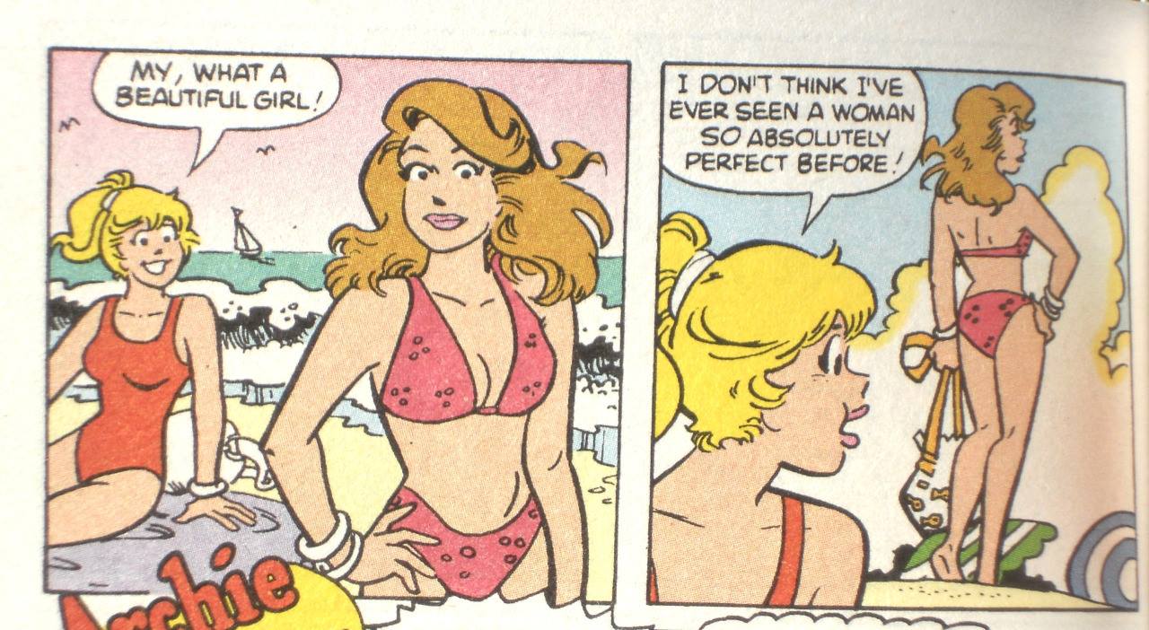Let’s go ahead and make this explicit. Archie really is not the primary motivator here: what we have instead are two queer girls who are working some shit out over his head. For Betty, Archie is handsome, athletic, absolutely uninterested, and—perhaps!—therefore safe. Betty dates men but rarely oggles them, except when Veronica is around: women are another story. “Look, Archie! Isn’t that a pretty girl?” she cries out on a beach trip in Archie's Digest 79, 1986. “Doesn’t she have a gorgeous body?” Nor is this the only time this happens.