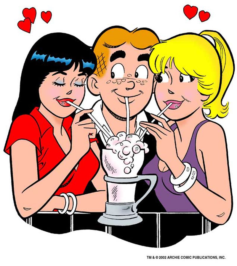 Archie (ginger, gap-toothed, girl-crazy) and his friends Betty (blond, tomboyish, Archie-crazy) and Jughead (whoopy-capped, wise, burger-crazy) debuted in 1941, in the pages of Pep Comics #22. Veronica (brunette, rich, confident) came along just a year later to complete the set. 1942 set the seemingly eternal dynamic in motion. Archie is eternally torn between Betty and Veronica, both of whom compete with one another to win the dubious honor of dating America’s Typical Teen.