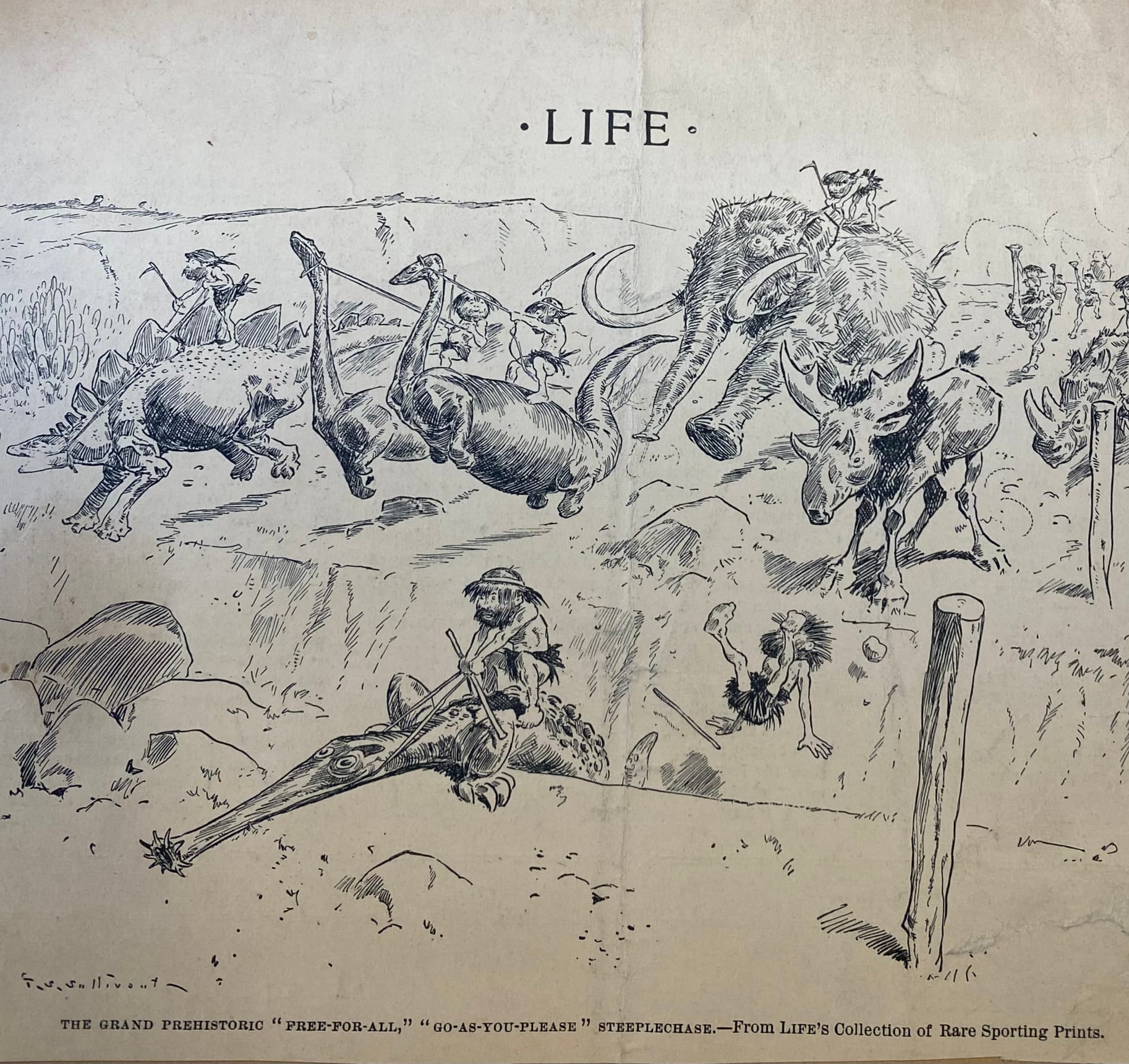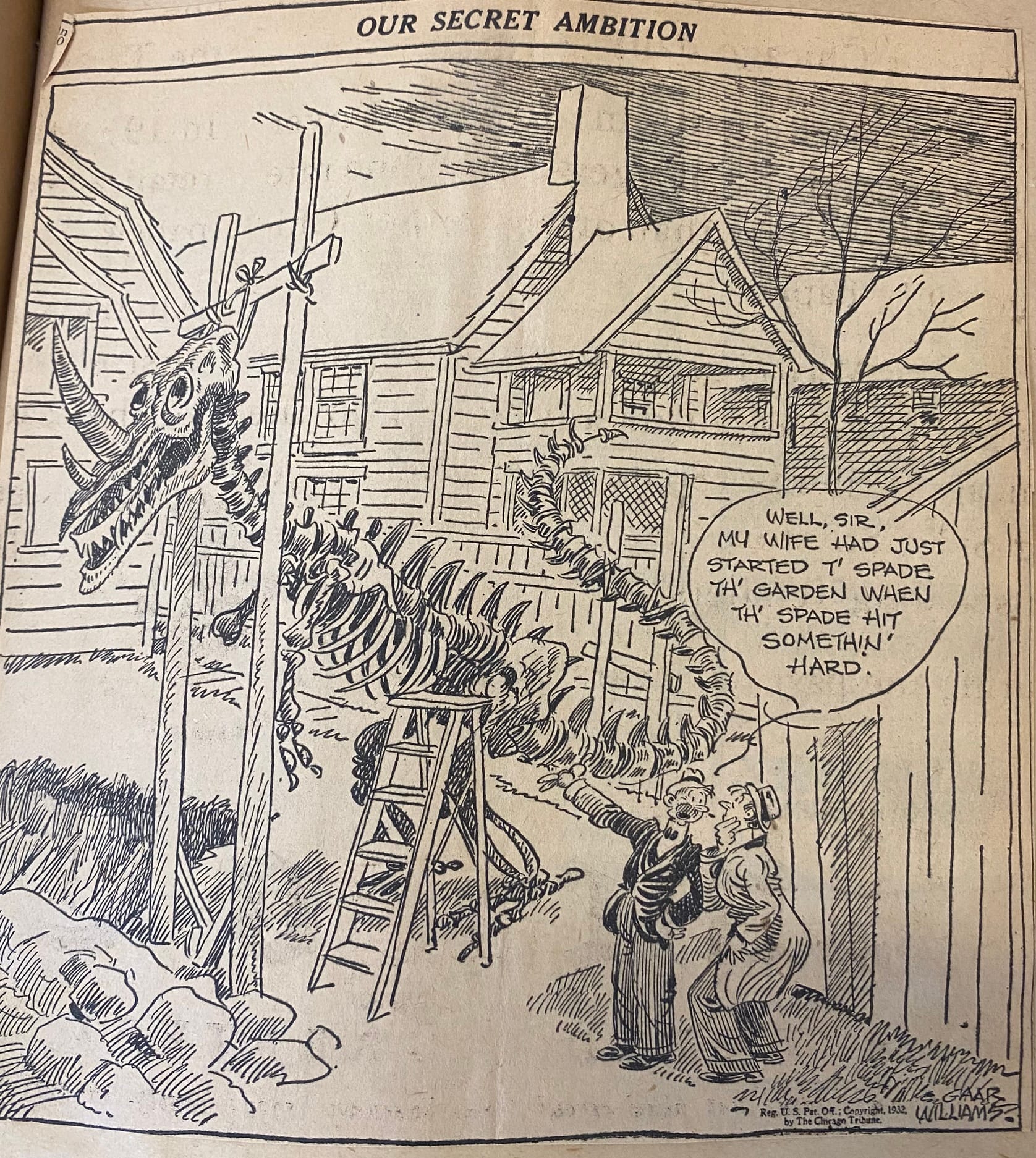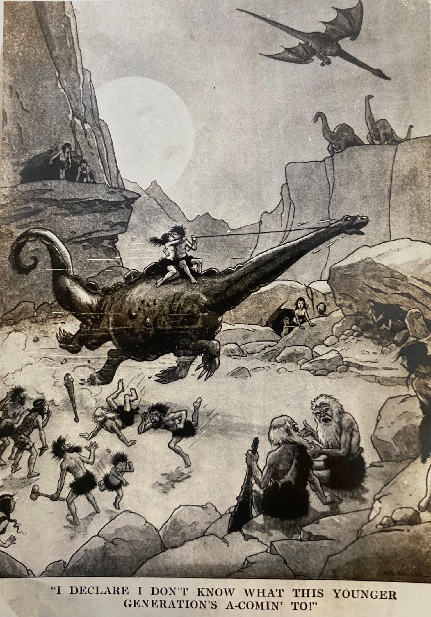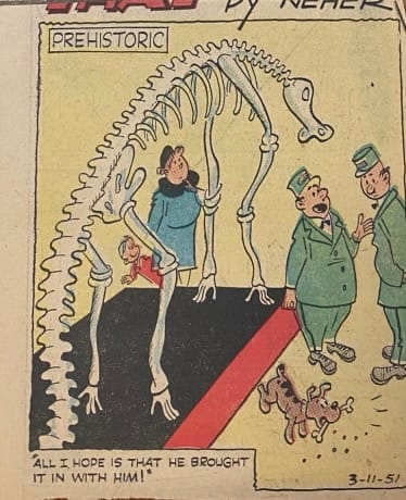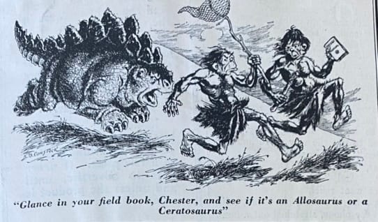 But as awareness of prehistoric beasts filtered out, they began popping up in other places. There were popular novels and animated projects, of course. But the beasts of distant epochs also began showing up in other places: poems published in magazines or circulated among scientists, humor columns, and – always and inevitably – newspaper cartoons. Many of which lasted only as long as the individual paper or issue, and found their way inevitably into the trash, never to be seen again.