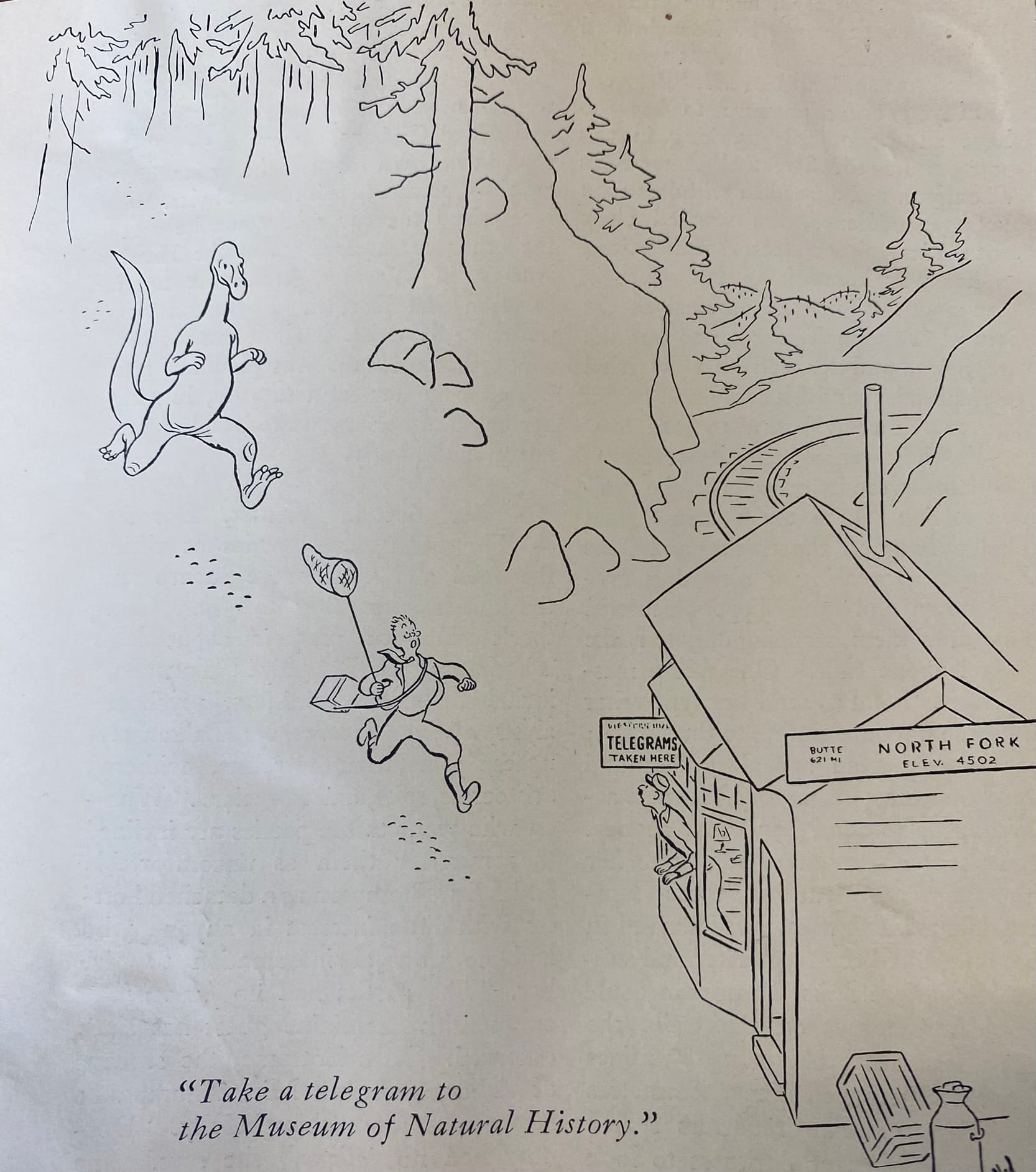 If cavefolk and dinosaurs are a natural theme to the deadline-stricken cartoonist, so is the unexpected survival of creatures assumed to be extinct. Here's Addams, again, working in his more usual style of the pleasantly macabre.