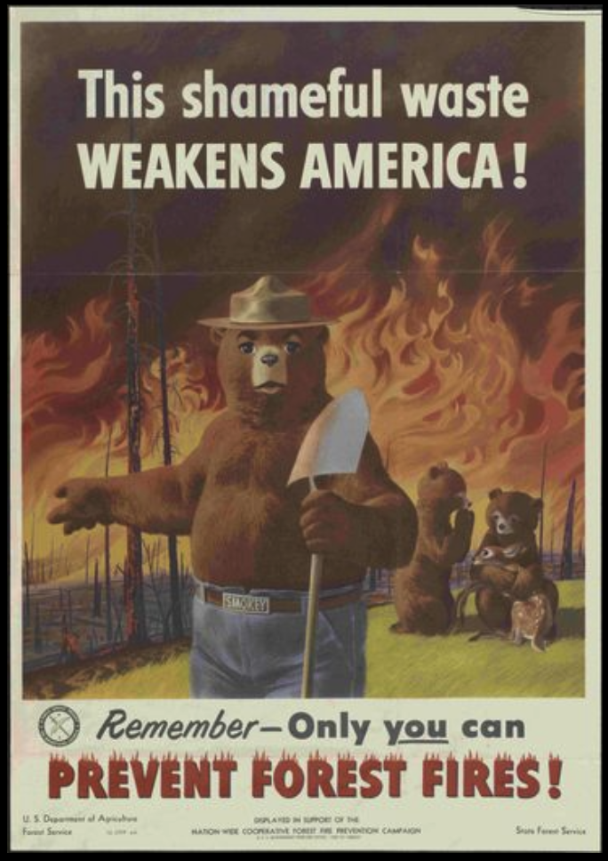 Within months after the Great Fire, the Forest Service declared that all fires could and would be prevented. All it would take is more money, more men, and more grit. By mid-century, federal law codified aggressive fire suppression through various policies: The Weeks Act of 1911 allowed the Forest Service to implement fire suppression strategies on state and private land; the ”10 a.m. policy” of 1935 sought to extinguish all fires by 10 am the next day; and the message that “only YOU can prevent wildfires,” was publicized widely by Smokey the Bear, the mascot of the U.S. Forest Service.